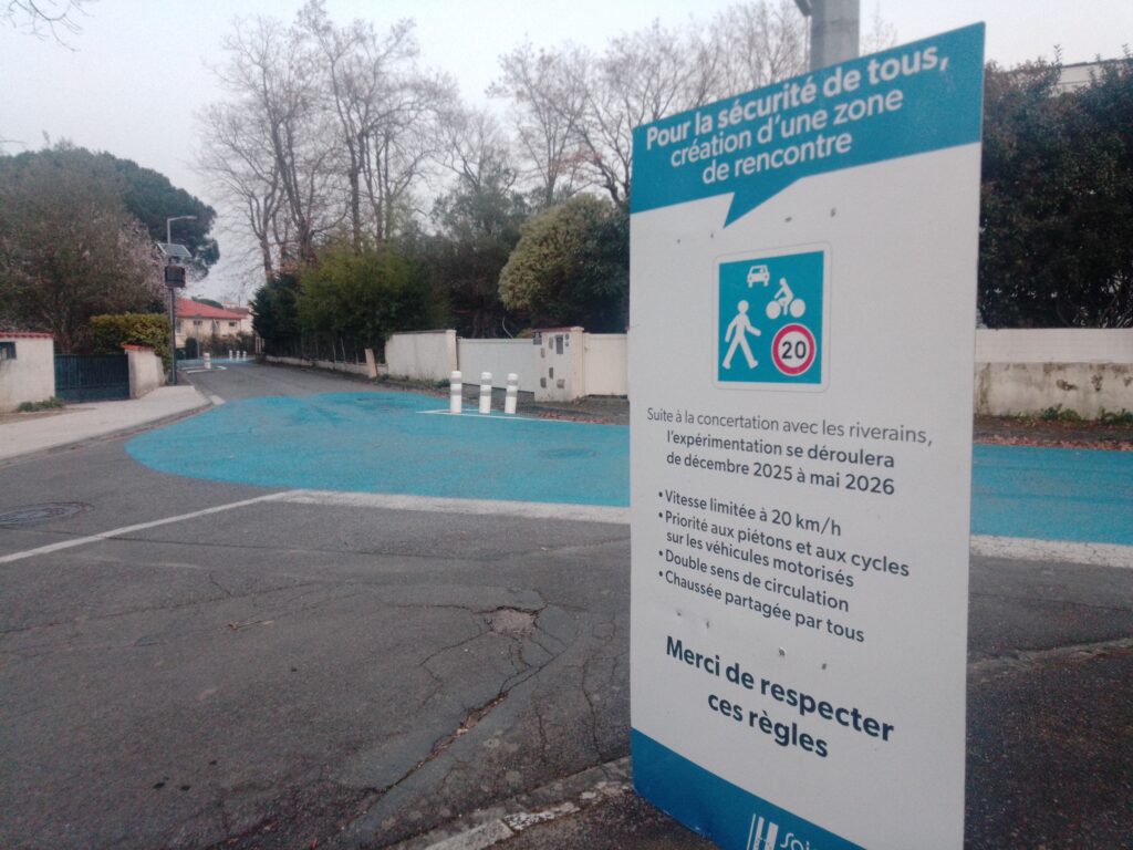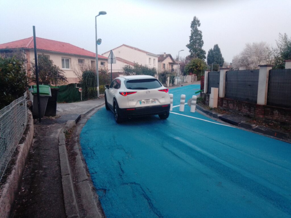Des séries de balises avaient été d’abord été implantées, pour matérialiser des chicanes, la vitesse limite étant de 30 km/h.