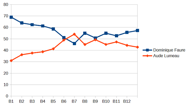 Pourcentage des voix en fonction des bureaux de vote.