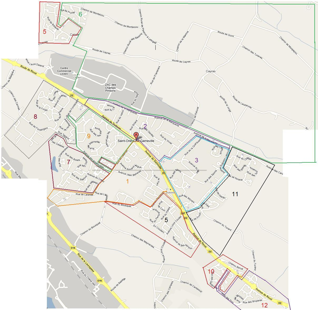 Nota : cette carte n’est pas tout à fait à jour : pour rééquilibrer le nombre de votants par bureau, des modifications ont été apportées, par exemple les électeurs de la rue des Capitouls sont allés voter à Catala.