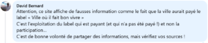 David Bernard, candidat sur la liste de Dominique Faure et des Jeunes En Marche 31, conteste sur Facebook le fait que la ville ait payé pour le label, et pourtant la liste Continuons Ensemble pour St-Orens publie ce label sur son dernier tract de campagne !